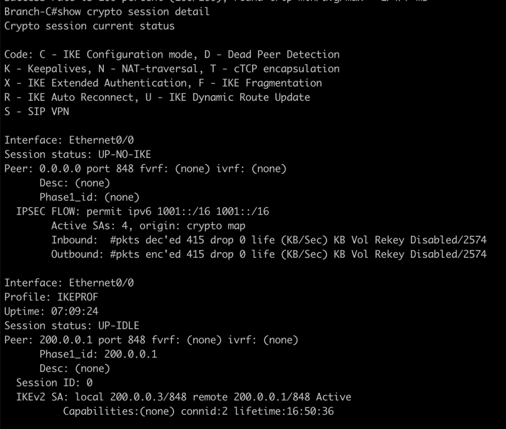 we can also check the communication ipv6 between branch is encrypted with ping command and check the encap/decap counters