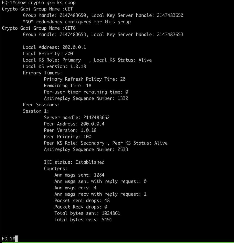 - Configure HQ-1 (Primary) and HQ-2 (Secondary) as a redundant KS for all GM in the networks.