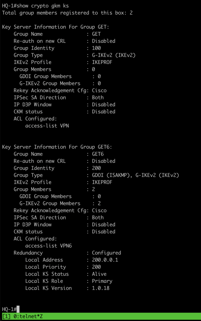 # copy the isakmp, acl ipv6, ikev2, ipsec profile from HQ-1 to HQ-23. HQ-1 configuring GKM G-IKEv2