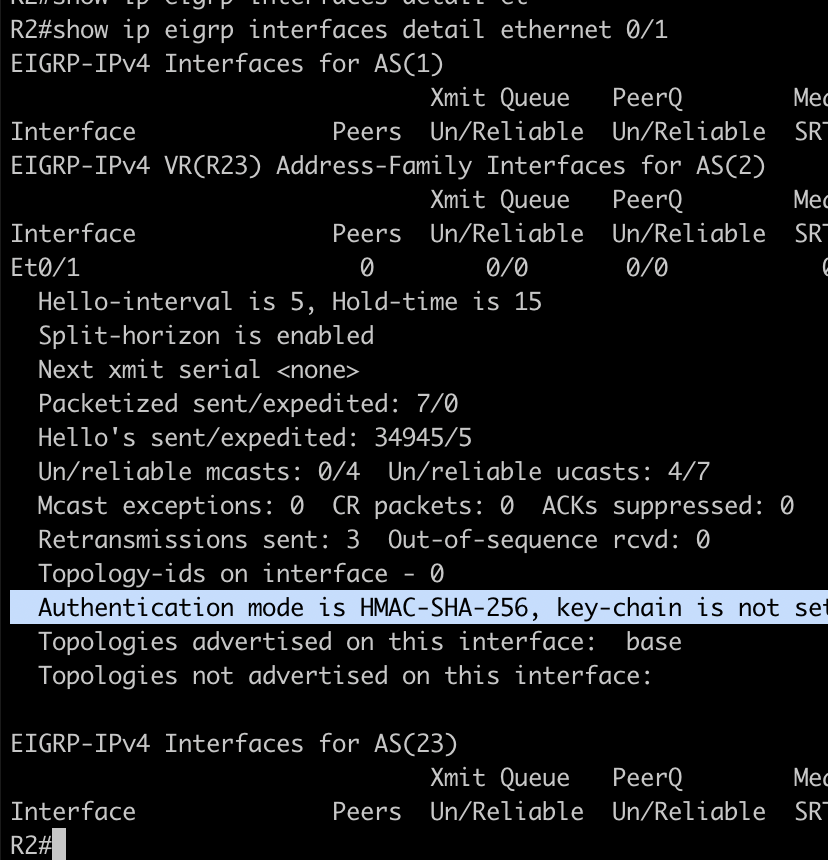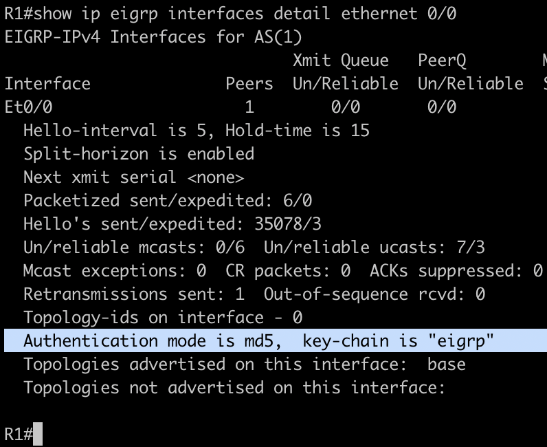 - key chain eigrp key 1 key-string myeigrp # attach to interface eigrp ip authentication mode eigrp 1 md5 ip authentication key-chain eigrp 1 eigrp # verification show ip eigrp interfaces detail ethernet 0/0